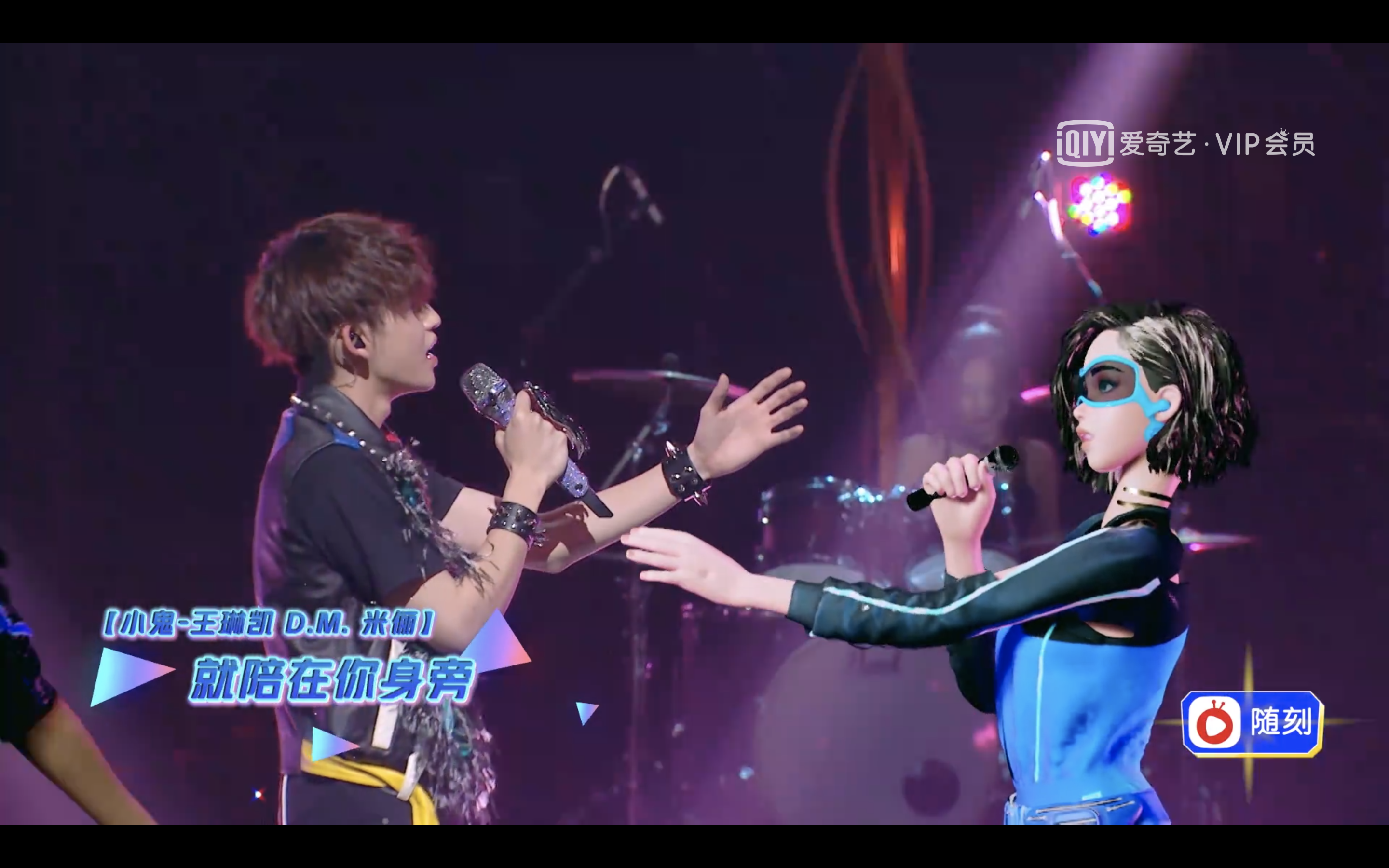 中国首档虚拟偶像才艺竞演节目《跨次元新星》在爱奇艺播出时的画面,真人歌手王琳凯与虚拟偶像米俪同台演唱。(图为爱奇艺视频截图)