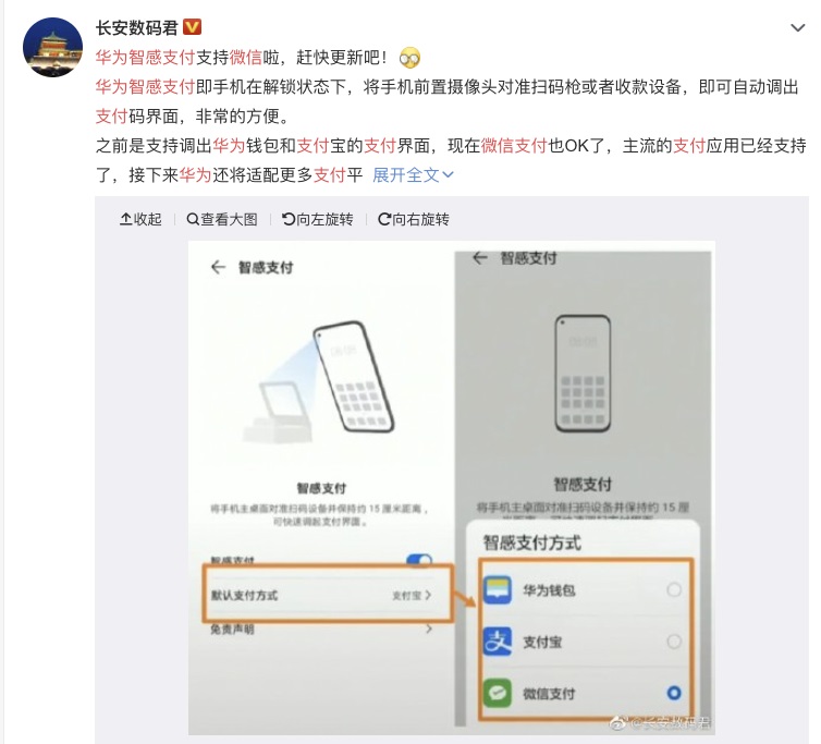 该博主表示,华为 Mate 30 系列和华为 Mate 40 标准版的用户进行软件升级后就可以设置微信支付了,华为 Mate 40 Pro 及保时捷版本用户还要再等一下。目前,华为智感支付已经支持华为钱包、支付宝和微信支付。