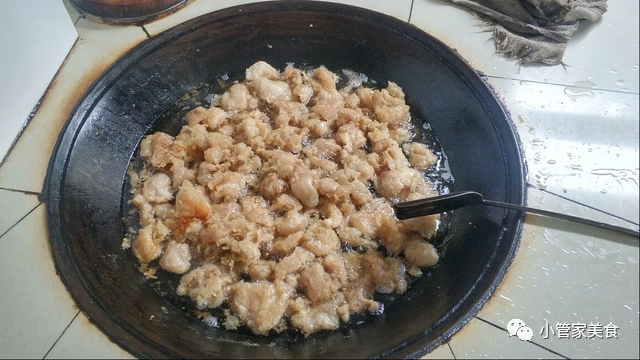 “油水不相融”锅中水分熬干之后剩下的就是猪油了,这个时候的油渣会出现有一些地方已经炸干了,还有一些地方圆润饱满,我们需要用勺子或者是铲子轻轻的压一下,这样里面的猪油就会渗出来。要不然不容易榨干。