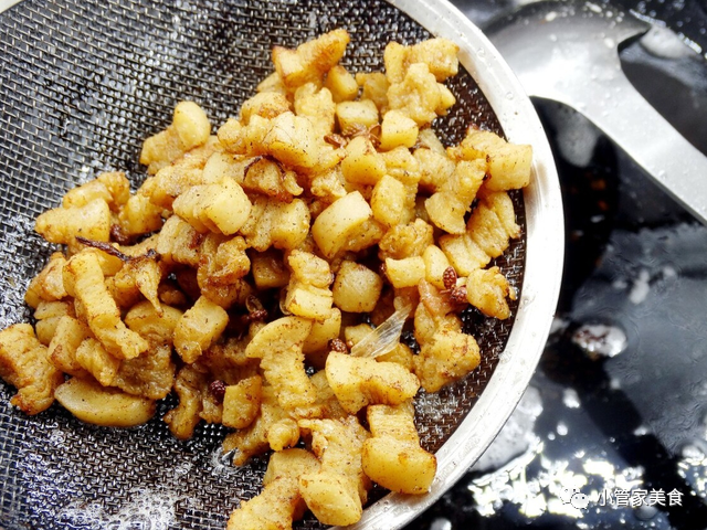 小提示:炼制猪油前期锅中有水的时候可以开大火,水分炸干之后就要关最小火了,要不然油温太高的话,油容易发黑而且油炸容易炸糊,只有小火慢慢炸才能把油炸炸成金黄色,相信看到这里你已经学会了如何熬猪油,很快就要过年了,如果家里杀年猪,就可以试试这样方法炼制猪油了。