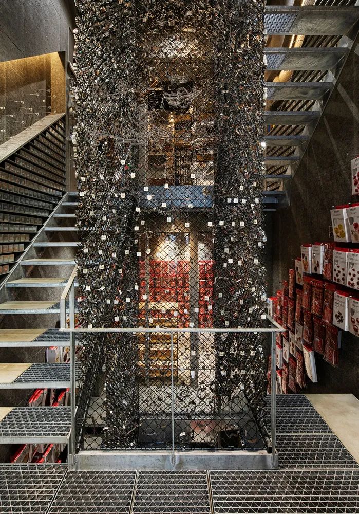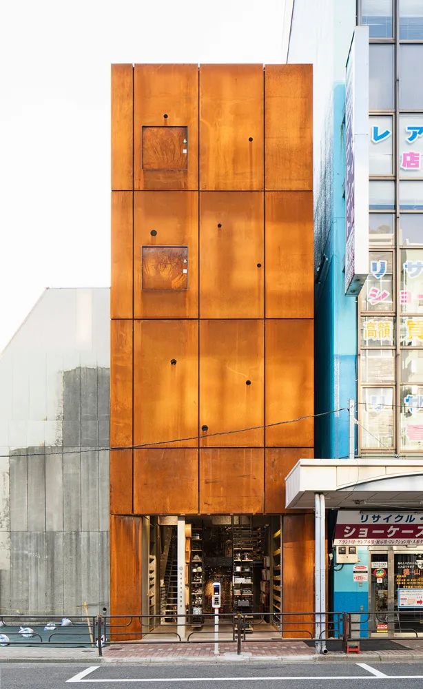 由KAMITOPEN设计的日本老牌糖果店‘幸福工具屋’,在内部空间的设置上,建筑师置入了错层空间,使得顾客可以在选择模具的同时,顺势在店铺内部上下游走。建筑师在店铺外侧的材料使用中选择了煤钢材质,充分利用了其时间越久强度越大的特性。