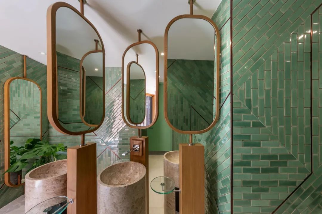 由D1 Architectural Studio设计的越南休憩咖啡吧则善于在视觉上挖掘和保留这栋楼的独特之处:双层砖墙、绿色水泥地面、70年代风格的阳台,既留下了建筑以前的影子,又能突出新的活泼外观和丰富的个性。绿色的水泥色被采用为这家咖啡店的主题色。团队希望通过对老建筑的层层剥析,展现这种对过去的致敬,形成过去与现在的联系。
