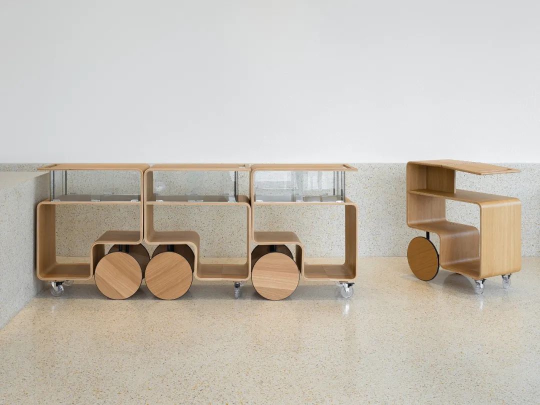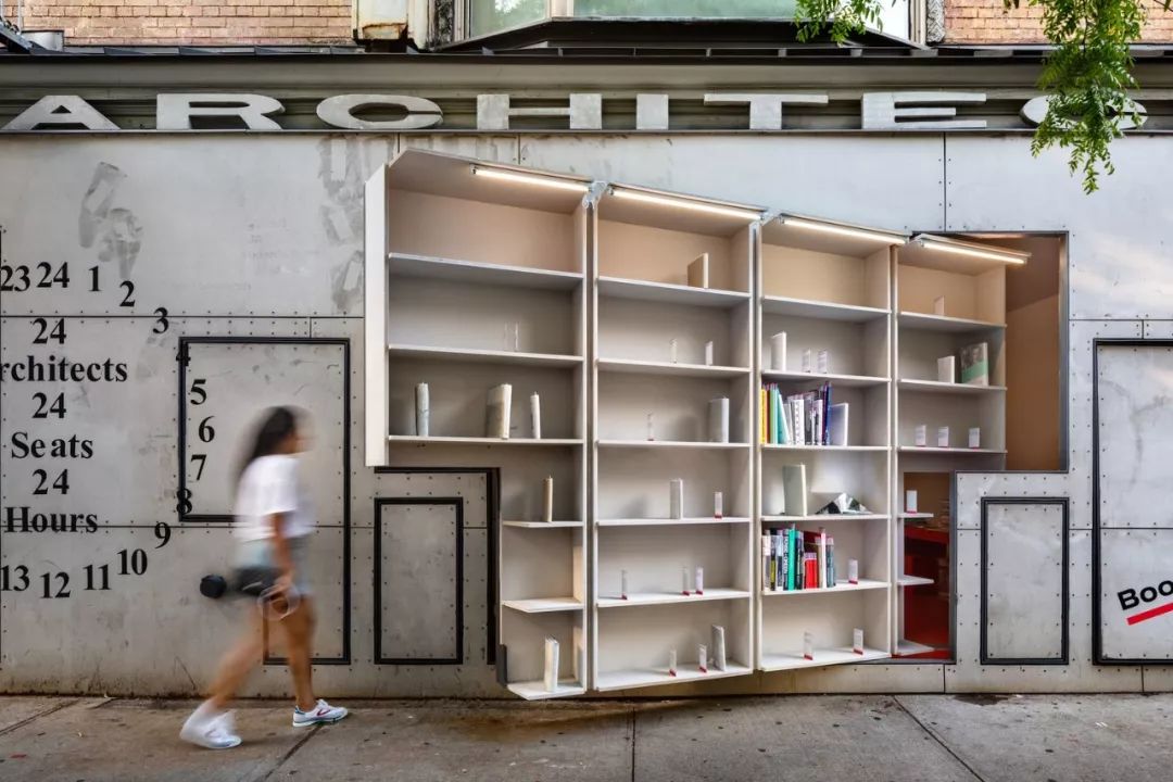 在由Abruzzo Bodziak Architects设计的Storefront艺术与建筑图书馆中,建筑师将画廊标志性的旋转立面图形拓展到了书架的设计上,以使其介入人行道所属的公共空间领域,从而为展览提供一个更大的公众平台,来促进市民的参与和对话。