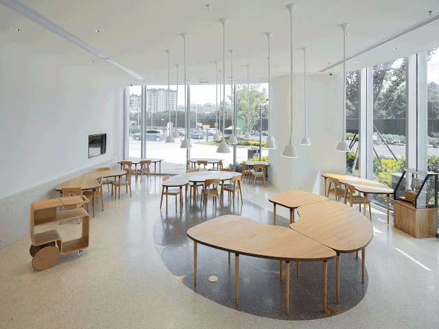 由非常建筑设计的上海宝山经纬汇店,希望让一个面包店同时成为一个社区中心。店的中心是一个蚕豆形的大饭桌,它由十个拼图式的小桌子组合而成,可以根据需要拆分组合。因为社区的居民在一天中对面包店的空间需求不尽相同:早上,小桌可供独自享用早餐;下午和晚上,大桌可用于不同大小的聚会,从几个人的烘焙课到一群人的生日会。大饭桌还可以用于面包和蛋糕的展示。