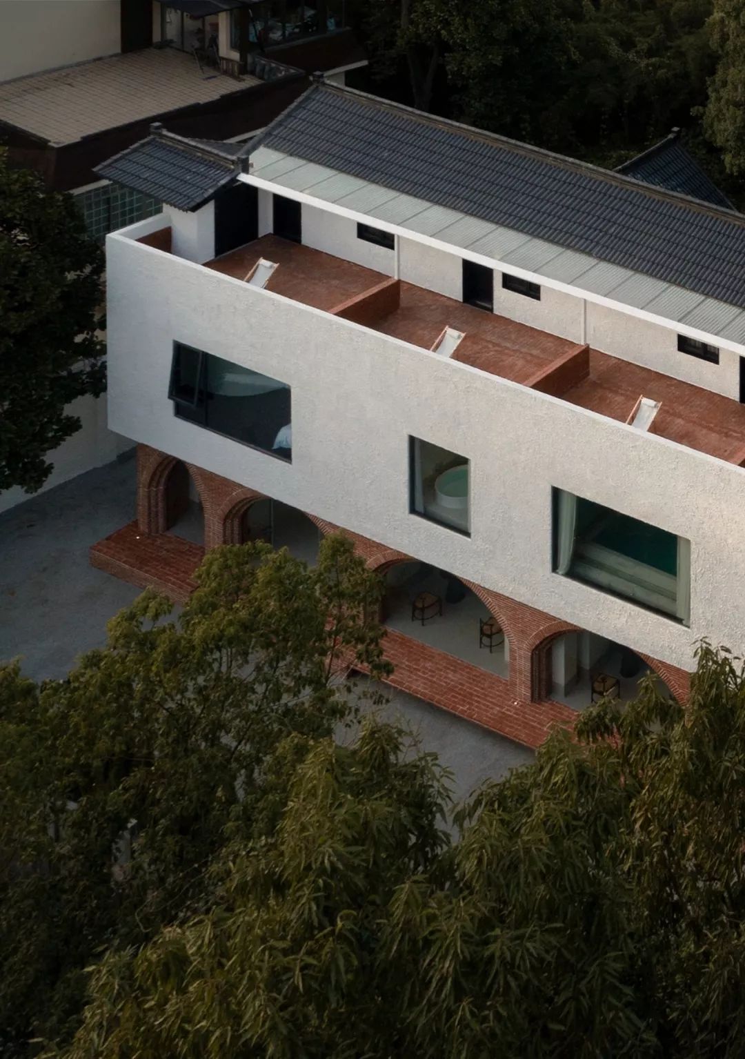 在由say architects设计的杭州里奈酒店中,建筑师希望将这个酒店打造成一个具有文化或艺术属性的场所,而不单纯是一个民宿,首层的公共空间承载了餐厅、礼品、接待、交流等属性;而独立的小房间在日常作为单独的一个套间使用,定期会转换成为一个小展厅展示独立艺术家的作品。