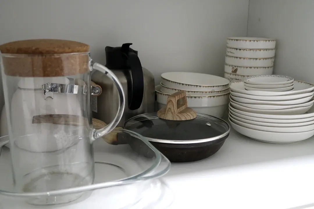第一部分是暴露在灶台上常用的东西,电饭锅、水壶、刀具、杯子、擦手布等等。