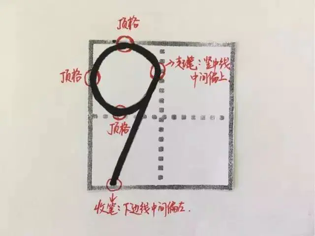 "9"的写法:在竖中线中间偏上一点儿的位置起笔,向上画弯,挨到上边线中间位置;再向左下画弯,挨到左边线中间位置;再向右下方画弯,挨到横中线中间位置;再向右上画弯,回到起笔处;再从这一点向左下方画直线,一直写到下边线中间偏左一点儿的位置收笔。