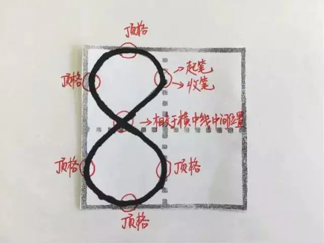 "8"的写法:起笔在左上格、竖中线中间偏上一点儿的位置,向左上画弯,挨到上边线中间位置;再向左下画弯,挨到左边线中间位置;再向右下方,穿过横中线的中间位置,挨到左下格的竖中线中间处;再向左下画弯,挨到下边线中间位置;再向左上画弯,挨到左边线中间位置;再斜着向右上方,一直画到起笔处收笔。
