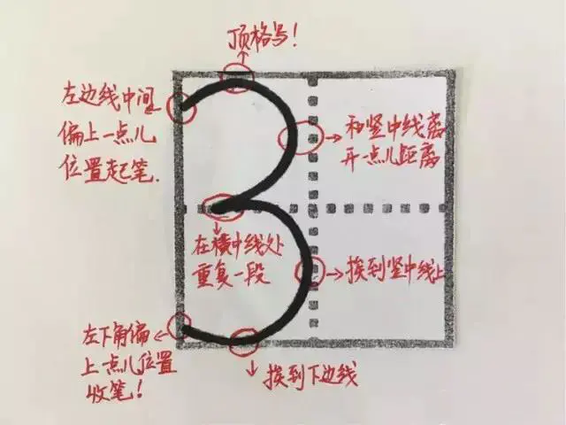 "3"的写法:从左上格、左边线中间偏上一点儿的位置起笔,向上画弯,挨到上边线中间位置;再向右画弯,快到竖中线(不挨到竖中线)时向左下弯,画到横中线中间偏左的位置;再沿着横中线向右重复一段后,向右下弯,挨到竖中线中间位置;再向左下弯,挨到下边线中间位置;再向左上弯,到左下角偏上一点儿的位置收笔。