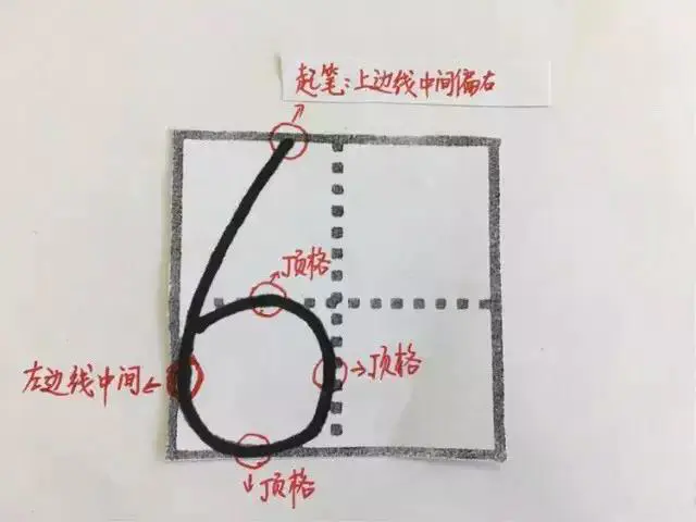 "6"的写法:在上边线中间偏右一点儿的位置起笔,向左下画弯,大约挨到左下格的左边线中间的位置;再向右下弯,挨到下边线中间位置;再向右上弯,挨到竖中线中间位置;再向左上弯,挨到横中线中间位置;再向左下弯,形成圆形后收笔。