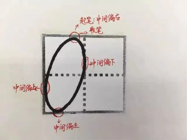 "0"的写法:找到左上格,在上边线中间偏右一点儿的位置起笔;斜着向左下弯,一直画到左下格,贴到左边线中间偏上一点儿的位置后;再向右下弯,画到下边线中间偏左的位置处;再向右上弯,一直画到左上格贴到竖中线中间偏下一点儿的位置后;再向左上弯,回到起笔处收笔。