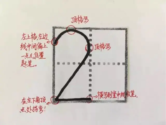 "2"的写法:找到田字格的左上格,从左边线中间偏上一点儿的位置起笔,向上画弯,挨到上边线中间位置;再向右画弯,挨到竖中线中间处;再向左斜,一直写到左下角的顶点处拐弯;再沿着下边线向右画横线,写到竖中线处收笔。