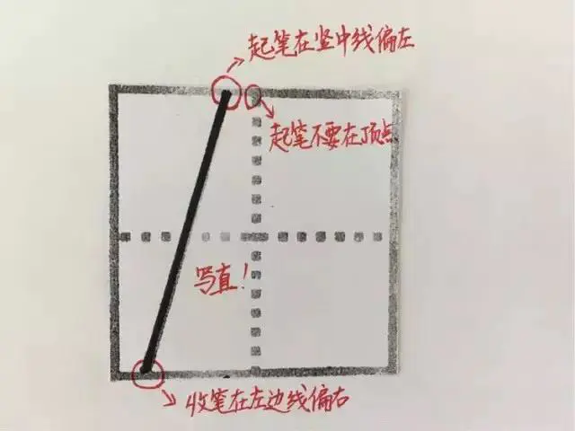 第二笔:起笔在竖中线偏左一点的位置,向左下方画直线,到下边线中间偏左的位置收笔。
