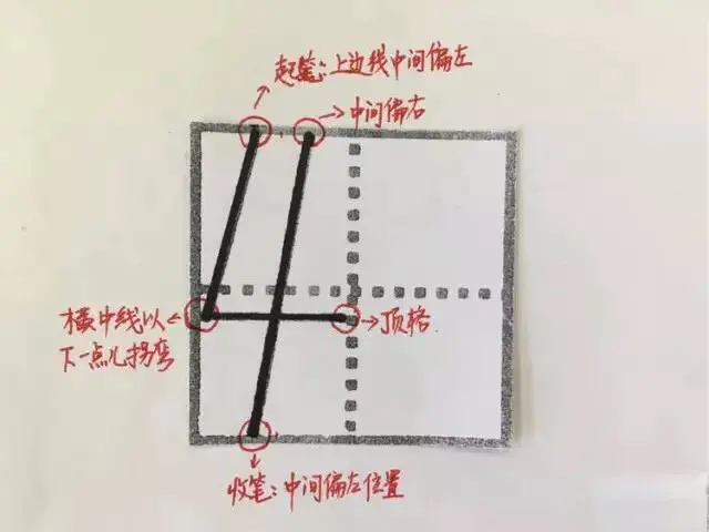 第一笔:起笔在上边线中间偏左一点儿的位置,向左下方画直线,写到横中线以下一点拐弯,向右画横线到竖中线处收笔。