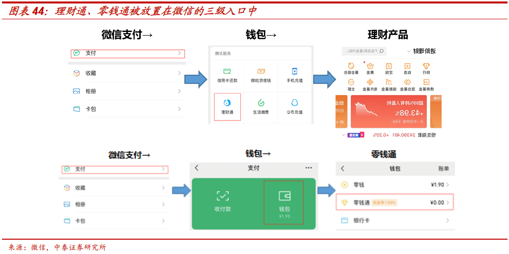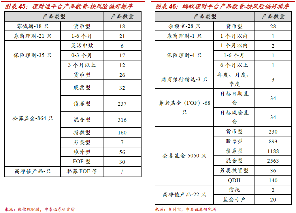 平台和渠道:微信的理财入口较深,独立性更强。微信APP作为核心平台渠道入口。理财通的入口在微信(理财通也有独立APP,但月活数远小于通用流量平台),微信也是理财通最重要的获客平台。区别于支付宝较早独立于阿里体系(支付宝APP、淘宝APP月活均超7亿),通过微信获客决定了理财通入口相对较深;针对目标客群推送产品,同时降低对腾讯核心社交客群的打扰。