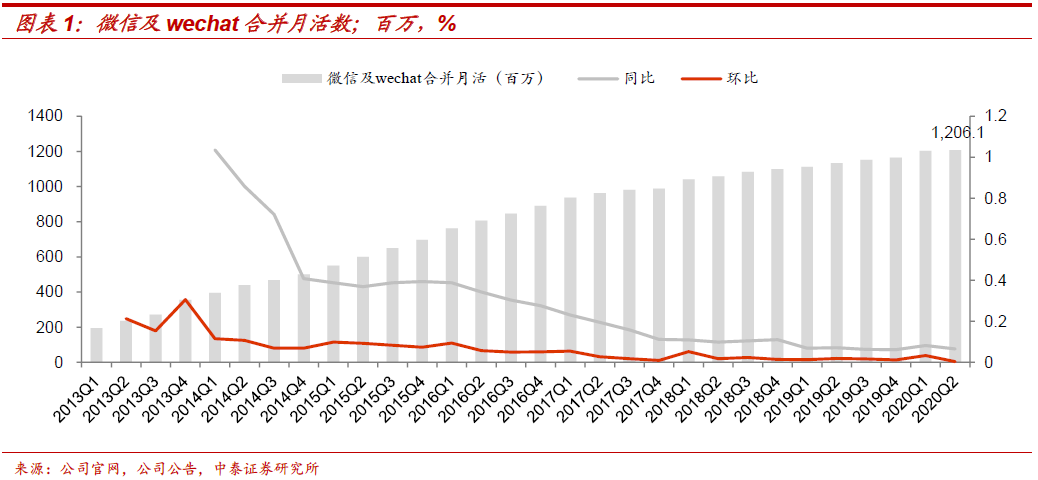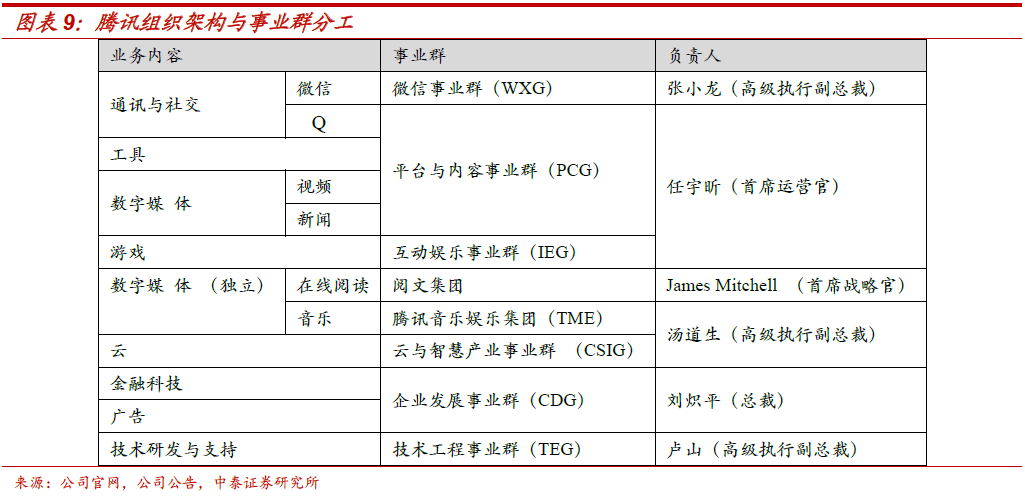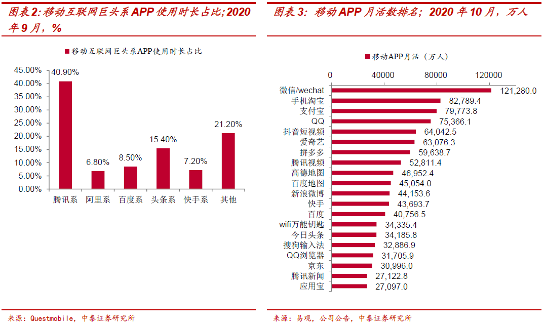 腾讯商业模式选择:是由其社交基因所决定。1、对于庞大的腾讯体系,可以理解为是以 QQ 及微信的社交平台,孕育着游戏、社交网络增值服务、金融科技及企业服务、网络广告及其他收入。腾讯是国内客户流量、用户时长处于领先的互联网公司。微信是天然的流量金矿,根据易观和公司年报数据,截至2020年10月微信及wechat合并月活数达12.13亿,排名第一;即时通信的高频刚需、及社交形成的天然粘性,根据Questmobile数据,在用户使用时长方面腾讯系也遥遥领先(40.9%领先于排名第二的头条系15.4%)。2、通过流量+资本打法,通过投资有机地联系了市场上各个领域的领导者。包括电商的京东和拼多多、本地生活的美团,都在各自细分领域逐步成为领导者,使得腾讯在获得高额投资回报的同时,整个腾讯系生态不断繁荣壮大。
