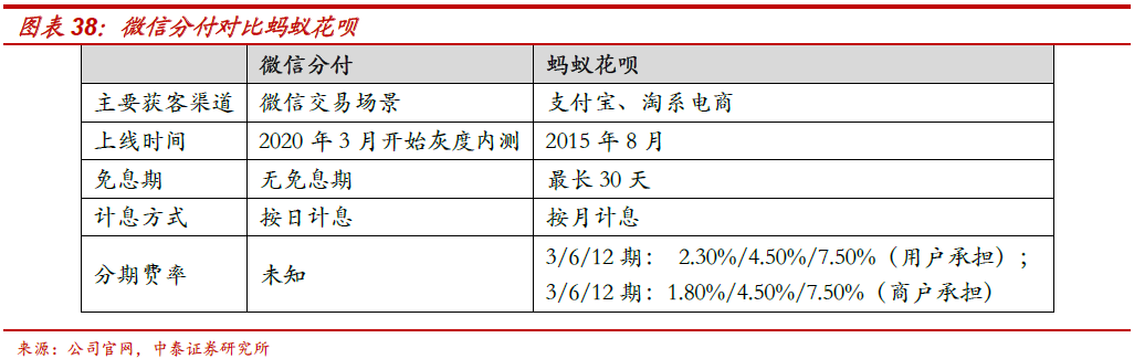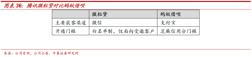 现金贷:微粒贷是腾讯金融借贷业务的主要产品。1、微粒贷通过微信获客,白名单制度体现谨慎性。微粒贷是由微众银行(联营企业,持股30%)推出的全线上、纯信用、随借随还的小额信贷产品。微粒贷和主要获客渠道是微信,而微信作为即时通讯社交为主的属性,微粒贷的入口较深(我-支付-金融理财的三级入口)。同时,微粒贷目前仍采用白名单制,仅面向受邀客户开通。2、消费贷产品若在未来推出,预计将利于打开现金贷规模增长空间。从蚂蚁花呗的启示:信用支付产品依靠免息、多场景渗透的方式吸引用户,用户数据的积累和风控模型的动态迭代,可为现金贷积累并转化用户。