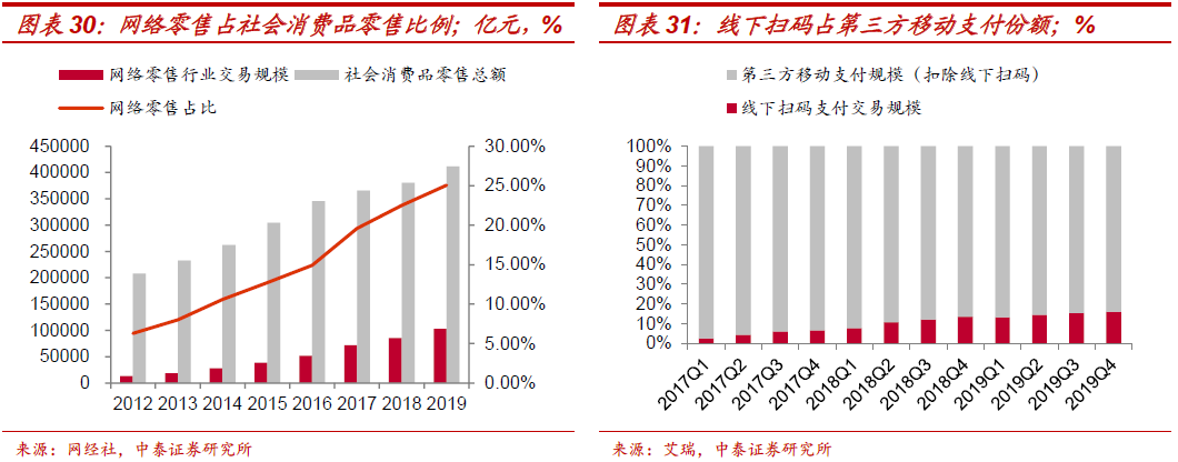 线下:扫码支付渗透率仍有提升空间。根据艾瑞数据,2019Q4线下扫码支付规模为9.6万亿,占第三方移动支付份额约16.1%,而2019年我国网络零售占社会消费品零售比例仅为25%,即线下零售是线上零售的3倍左右,线下扫码支付渗透率仍有提升空间。根据中国支付清算协会数据,2019年生活类渗透率98%,公共出行和缴费类渗透率78%,商旅、票务、理财类超过50%,娱乐下载32%。可以看到,在餐饮、商超、零售等线下小额高频场景中,移动支付的渗透率较高;未来在“大额、低频”的线下现金/银行卡支付场景,如娱乐、交通、酒店、医疗等领域,线下扫码仍有继续渗透空间。