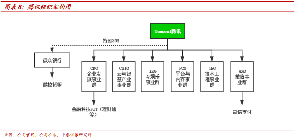 3、体现在组织架构:相对更为独立。微信支付、微粒贷、腾讯金融科技分属于三个不同事业群和经营主体,协同性较弱、统筹难度相对大。