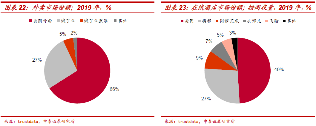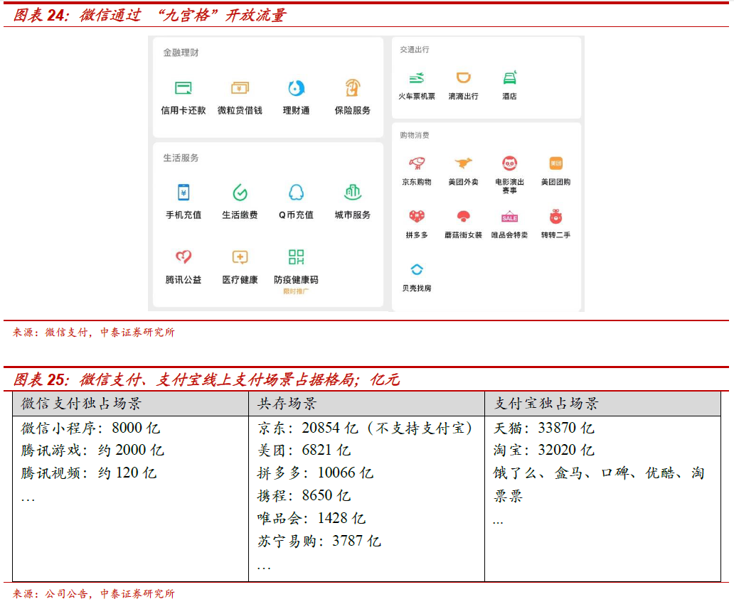1、线上支付场景之一:腾讯投资生态,以合作而非控股方式,找到开放微信流量与控制自身边界的平衡点。从而分享生态扩张与投资收益,并占领支付战略高地(高频流量、粘性及数据意义)。与美团、拼多多等联营企业,通过开放九宫格等形式输出流量、及嵌入支付(优先级高)。互联网巨头对线上生态的争夺激烈,微信支付独占线上场景包括微信小程序、腾讯游戏及腾讯视频等,尤其小程序自2017年推出后近年来迅速增长;支付宝独占的线上场景主要为天猫、淘宝,以及饿了么、盒马等阿里本地生活及数字生态;而在共存场景中,腾讯投资生态的市场份额正逐步拉近与阿里生态的距离,尤其在京东、美团、拼多多支付场景中,微信支付位置更靠前、优先级更高。根据网经社数据,在网络零售B2C市场交易份额中,天猫份额仍保持50%以上,但趋势呈逐渐下降,由2014年59.3%下滑至50.1%;而以京东、拼多多、唯品会为代表的腾讯投资生态公司的份额,合计由2012年22.3%提升至2019年41.2%,其中最大贡献是拼多多的份额提升(2016年0.2%提升至2019年12.8%)。另外,美团领先本地生活份额,2019年外卖份额66%、在线酒店份额49%。