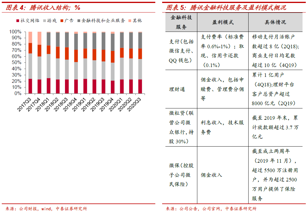 腾讯生态圈与金融的融合点:支付业务战略重要性高(支付是升级各种连接的基础),而对金融变现相对“克制”。金融科技与企业服务收入贡献持续提升(3Q20占比约26%)。