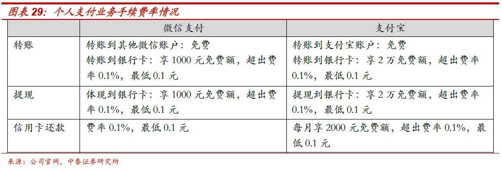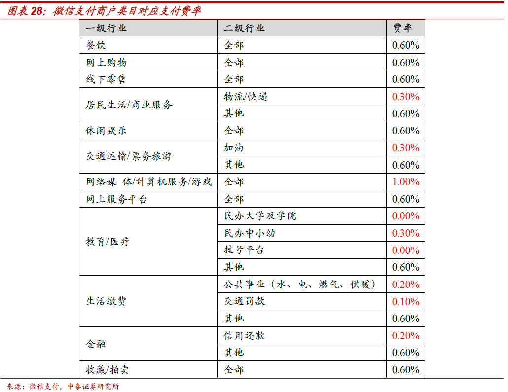 费率如何变化?整体支付费率预计保持平稳,微信支付的费率提升空间相对较大。支付宝为阿里系提供的支付服务定价较低,预计这一定价水平将持续,支付宝在拓展支付场景时会战略性地制定较低的费率来做大业务规模,增加生态场景。微信支付在美团、京东及其他线下第三方场景市场份额较高,定价更趋于市场化。