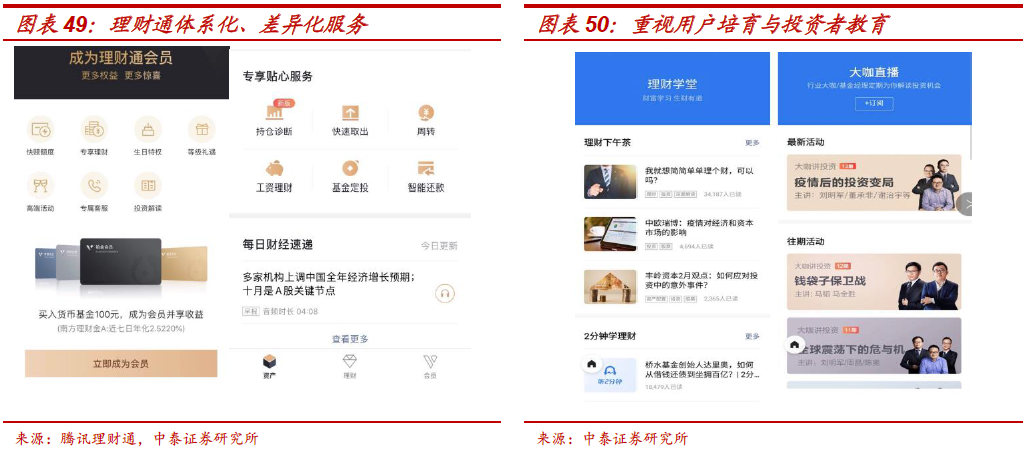 投资者教育:重视度高,与腾讯客群更长尾(理财知识相对更薄弱)相关。1、提供理财专业知识库、直播等投教内容,围绕投资平台功能、投资方法和市场解读等,帮助用户建立投资理念,同时开展理财通大讲堂等一系列投资者教育活动。2、通过投资基础知识、基金百问百答、市场解读、资产配置月报等内容,帮助用户理性投资。同时,平台也通过解析欺诈案例,让投资者识别投资圈套,避免财产损失。