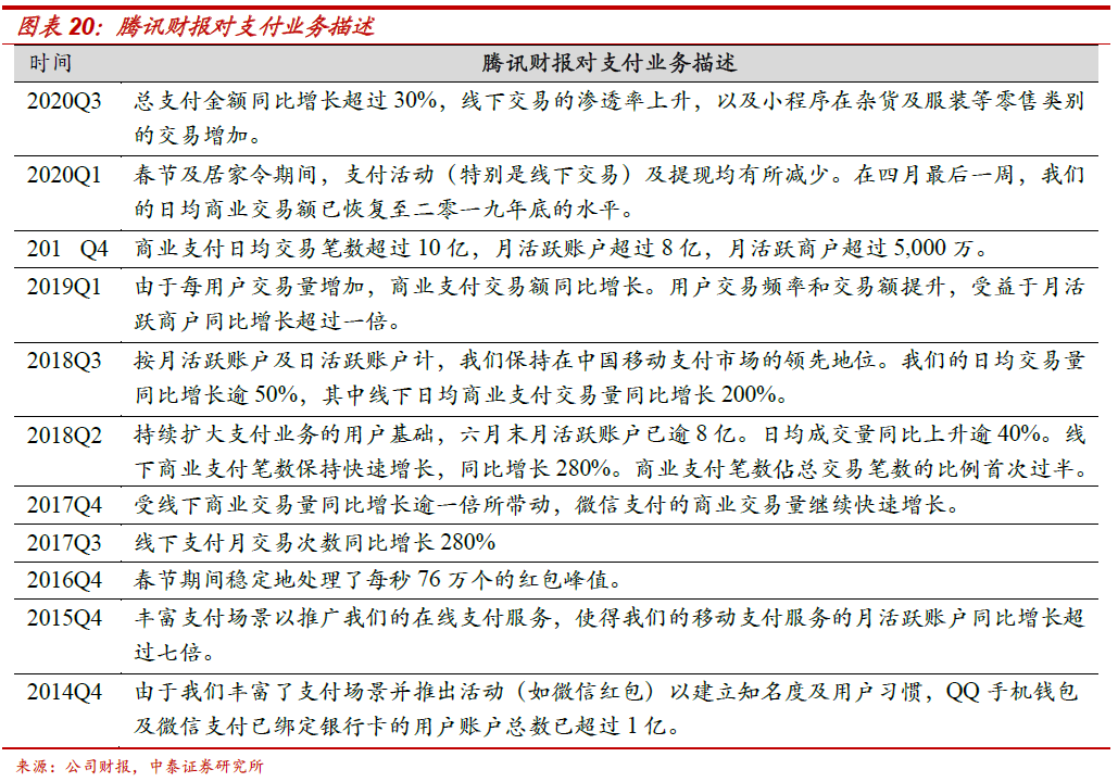 腾讯支付业务的模式:1、线上支付场景之一:腾讯以合作而非控股方式,找到开放微信生态与控制自身能力边界的平衡点。做大生态、获取投资收益,并占领支付战略高地(高频流量、粘性及数据意义)。与美团等联营企业,通过开放九宫格输出流量、及嵌入支付(优先级高),逐步抢占电商(京东、拼多多等腾讯系电商B2C份额由2012年22.3%提升至2019年41.2%)及本地生活份额(美团2019年外卖份额66%、在线酒店份额49%)。2、线上支付场景之二:以微信小程序为杠杆,撬动体内商业交易生态。小程序以轻量级应用模式直接触达App的内容和服务,挖掘微信潜在交易属性、打造腾讯电商闭环,扩大支付份额。2019年小程序DAU达4.1亿、GMV 8000亿(同比+160%)。3、线下支付场景:凭借社交用户量+启动频次,迅速提升份额。根据艾媒数据,线下约65.6%的网民习惯于微信支付,微信支付在线下特点是小额高频、长尾下沉。