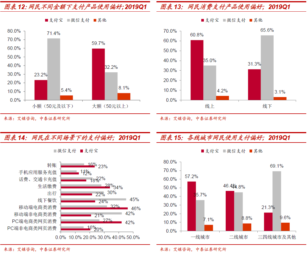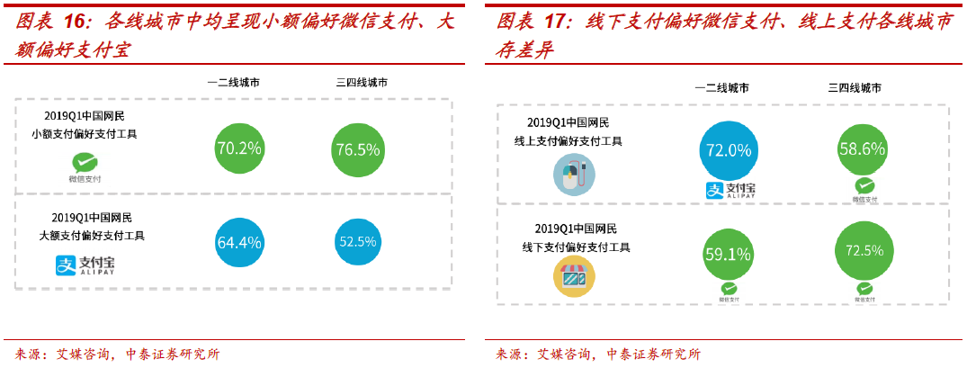 微信支付与支付宝对比:各类场景互有胜负。参考艾媒咨询调研报告数据,1、小额vs大额:小额偏好微信。在小额支付时(50元及以下),超七成(71.4%)网民偏好使用微信,而在大额支付(50元以上),约六成(59.7%)网民更喜欢用支付宝支付;2、线上vs线下:线上偏好支付宝(60.8%),线下偏好微信支付(65.6%)。阿里优势在于对线上电商份额的领先,以及支付宝的独占性。3、各类场景比较:微信支付优势在移动端非电商类消费及线下餐饮,支付宝优势在电商类消费。对比各类场景,体现出明显差异的场景包括,微信明显领先支付宝的两个领域为移动端非电商类消费(42.1%vs20.9%)、及线下餐饮(45.1%vs23.7%),而支付宝大幅领先微信支付的两个领域为PC端电商类消费(42%vs26.6%)、及移动端电商类消费(46.2%vs31.8%);其他场景双方差异不大,基本符合用户心智及市场认知:微信支付在出行、话费和交通卡充值场景占优,支付宝则在PC端非电商、生活缴费、手机应用充值、转账等场景占优。4、各线城市对比:一线支付宝占优(57.2%vs35.7%)、二线均势(46.4%vs44.8%)、三四线微信占优(69.1%vs21.3%)。微信国民级app流量优势尽显,在下沉市场的渗透和覆盖度更高。另外,在各线城市中,支付宝在大额支付情景下都有明显优势,微信支付在小额支付场景下更受欢迎;各线城市的受访网民在线下场景中均偏好微信支付,而在线上场景中一二线更偏好支付宝(72%)、三四线更偏爱微信(58.6%)。
