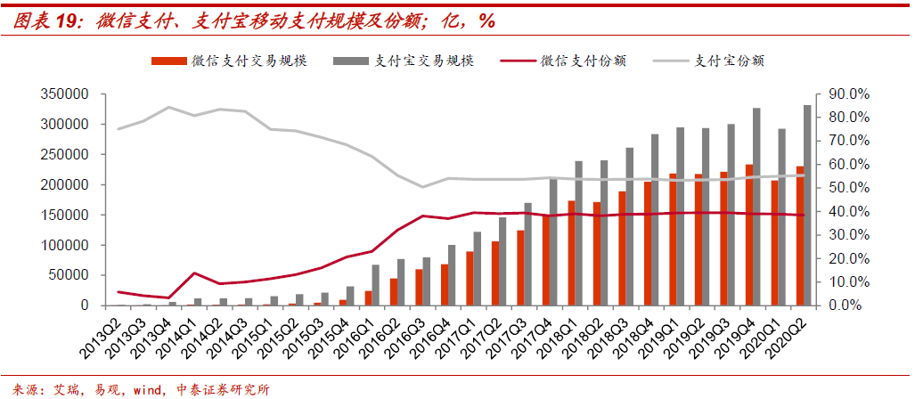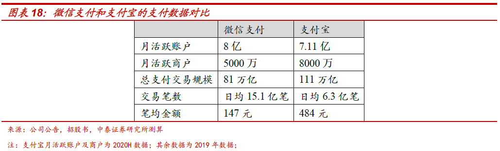 微信支付业务模式:基于微信流量金矿,连接C端用户与B端商户。C端数字钱包提供场景覆盖广泛、使用便捷的支付工具,另外微信支付的入口位于微信APP中,具有高频属性,除了社交场景,微信还通过小程序和支付页面提供丰富的支付场景。B端为商户搭建收款功能,同时赋予营销、客户、资金管理等商家服务,C端流量吸引B端商户,B端场景拓展满足C端支付需求,形成正向反馈。截至2019年末,微信支付月活跃账户数和商户数分别达8亿和5000万,根据艾瑞咨询发布的移动支付交易规模及市占率(2019Q1-Q4,移动支付行业交易规模分别为55.4/55/56/59.8万亿,微信支付市占率分别为39.4%/39.5%/39.5%/39%),我们测算腾讯支付业务的2019年总支付交易规模81万亿,2020Q2移动支付市场份额为38.5%,仅次于支付宝。由于微信支付大量社交红包及转账,以及微信在线下扫码市场份额更高,与支付宝相比,微信支付特点是小额、高频,根据公司官网披露的2019年支付业务客户投诉数据(2019年微信支付/支付宝的交易类客户投诉事件分别为60588/20638次,涉及交易笔数占比分别为0.000011%/0.000009%),我们推算2019年微信支付日均交易笔数15.1亿笔,约为支付宝的2.4倍,而笔均金额约147元,支付宝为484元。