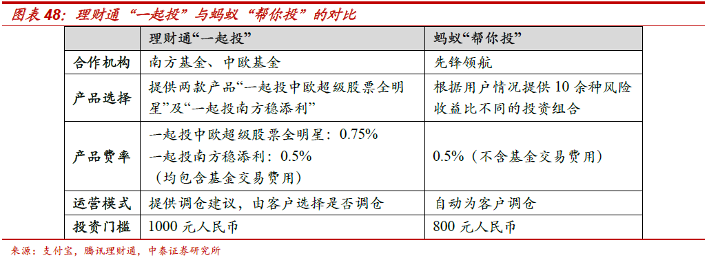 理财通“一起投”与蚂蚁“帮你投”的差异。1、合作方:“帮你投”与先锋领航合作:“一起投”选择中欧及南方两家基金公司投顾产品进行合作;2、底层资产配置选择差异:“一起投”多选取主动权益类基金做底层资产,而“帮你投”则更倾向于指数类投资工具配置;3、交易成本差异:“帮你投”每年收取资产管理总额0.5%的服务费(按季度收取)、基金申购费及调仓费用,而“一起投”不收申购费和调仓费,投资顾问费用按照策略风险不同分别为0.5%/年和0.75%/年。