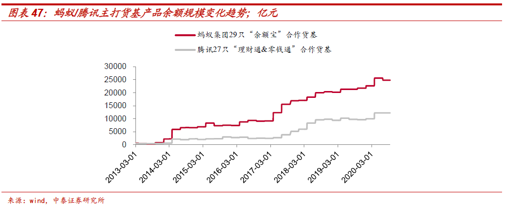 现金管理产品:腾讯分别通过“零钱通”和“余额+”两个产品实现支付和理财功能。蚂蚁在现金管理产品方面具有先发优势,于2013年推出了具有创新性的余额宝产品,以兼具便利性和收益性快速聚集客户,实现了规模的快速扩张。余额宝账户可以用于支付,也可以购买其他理财产品。腾讯首先在微信钱包中增加了零钱通,零钱通可直接用于支付功能,在支付的基础上增加了零钱的收益性,但与理财业务相隔离。之后腾讯在理财业务板块的理财通里增加了“余额+”,作为货币基金的统一账户,该账户可以直接购买理财通里的其他理财产品,也可以用于还信用卡、还贷款、充话费等场景,“余额+”的推出弥补了零钱通在功能上的不足,对于资金沉淀和理财业务转化具有推动作用。截至2020上半年,腾讯27只“理财通&零钱通”合作货基的规模为1.22万亿元(包括非腾讯渠道)。蚂蚁29只“余额宝”合作货基规模为2.48万亿(包括非蚂蚁渠道,天弘余额宝均为蚂蚁渠道)。