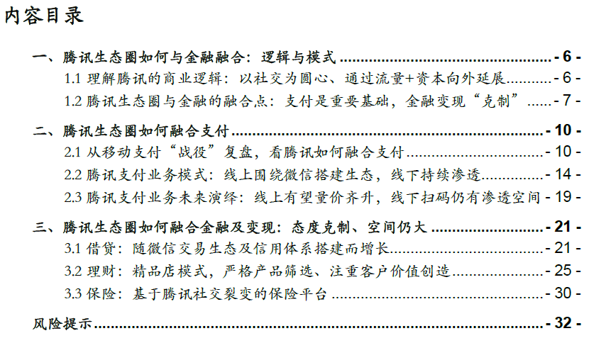 腾讯生态圈如何融合金融、并实现变现:态度克制、空间仍大。腾讯生态圈与金融的融合,总体相对谨慎、克制,始终是站在微信社交属性与金融工具属性的平衡点;而没有过度商业化的微信,也意味着金融变现的潜在空间仍大。