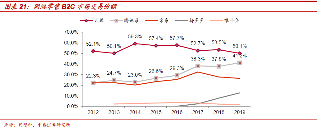 线上:腾讯投资生态+微信交易生态迅速增长。如前所述,随着腾讯系投资生态(美团、拼多多为代表)迅速挤占阿里电商核心盘,以及小程序挖掘微信潜在交易属性,依托小程序打造电商闭环。