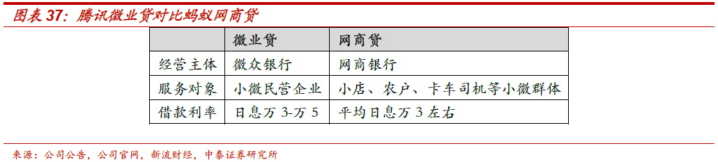 小微贷:微业贷。1、微业贷是腾讯的联营公司(持股30%)微众银行于2017年推出的全线上、纯信用、随借随还的小微企业流动资金贷款产品。区别于网商银行网商贷主要依托阿里系电商平台大数据,为体系内小微商户提供信贷;根据新流财经,从微业贷的用户结构来看,其布局的是一种“更为下沉”的方向,主要面向广东、河南、江苏、山东等十多个省市和地区的小微企业,并不局限在个别场景中,通过朋友圈广告、助贷平台等广泛获客,微业贷30万左右的户均余额也更接近银行小微贷款。根据新流财经数据,截至2019年11月末,微业贷服务企业数超过80万户,授信企业超过20万户,贷款企业超过13万户,微业贷授信金额近1000亿元,放款金额近1400亿元,管理贷款规模近400亿元。2、仍需要在交易生态建立中积累商户数据。小程序打造腾讯系电商生态闭环的同时,在线下需积累小微商户数据,尤其间连转直连后对商户数据的更好触达。3、空间角度,小微金融的信贷需求有待进一步满足。小微企业对GDP的贡献率达到60%,但其信贷需求未被充分满足。金融监管部门加大对小微企业的信贷扶持力度,加强对小微企业信贷的投放力度。预计未来三年小微金融信贷规模将保持较快的增长速度,预计复合增速可达25%以上。