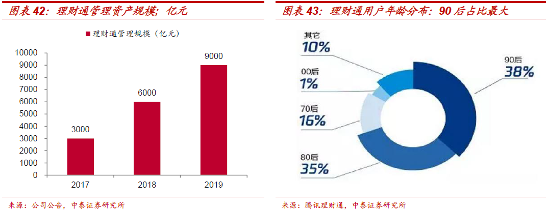 客群:以年轻客户为主,未来成长性强。1、客群基础:背靠国民APP微信12亿C端流量,是“躺在”流量上的公司,C端客户基础相较蚂蚁更具天然优势;目前理财通累计注册用户超2亿,2019年理财通管理资产规模为9000亿元;2、客群特征:年轻客户多,90后占理财通用户总量第一(理财通五周年大数据:90后、80后、70后、00后、其他占比分别为38%、35%、16%、1%、10%),不乏大量客单价较低的理财小白,但未来成长性强;3、获客挖掘:社交、支付等生活场景的海量数据,提供精准营销坚实基础,C端客户渗透率(目前理财通2亿客户)仍有很大挖掘潜力。