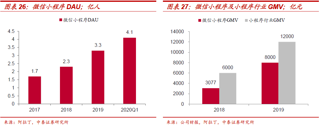 2、线上支付场景之二:体内商业交易生态逐步成型。微信交易生态,小程序挖掘微信潜在交易属性。依托小程序打造电商闭环,同时赋能金融支付、信息流广告、云服务等其他业务。微信于2017年上线小程序,以轻量级应用模式直接触达App的内容和服务,基于微信庞大社交流量,凸显微信的平台价值,是微信商业化延展的重要一步。微信小程序日活(DAU)由2017年1.7亿提升至2020Q1的4.1亿,根据微信公开课,2019年小程序累计交易额超8,000亿元,同比增长160%,其中电商、零售行业同比爆发式增长。受疫情影响,2020年春节期间,从第三方数据看到小程序、企业微信、腾讯会议等用户数和活跃度都有明显增长。根据阿拉丁报告,小程序DAU由2019年12月的3.3亿增至2020年2月的4.5亿,小程序数量由2019年12月的330万增长至2020年2月的390万。