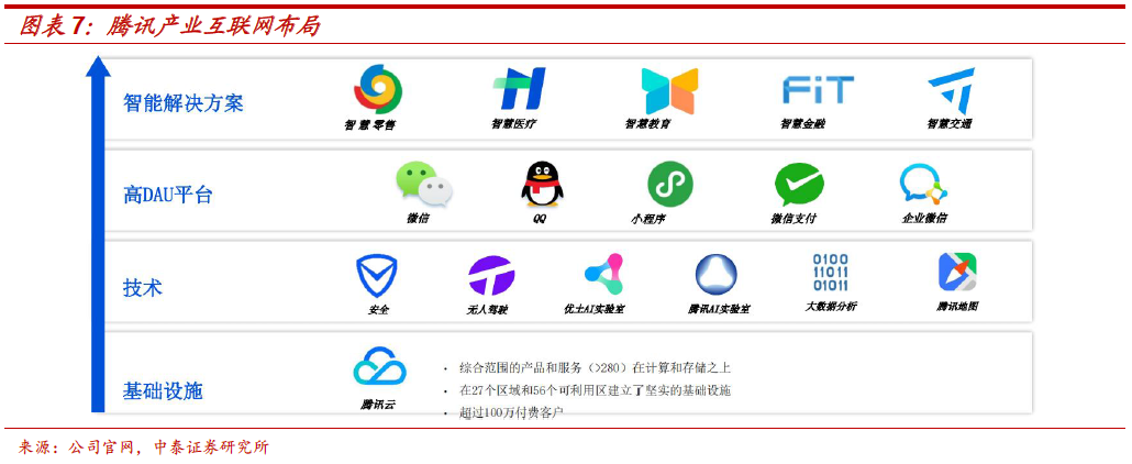 金融、尤其支付,是腾讯从社交(连接人与人)向外延伸(连接人与内容和服务、连接人与商业)的前提和基础。腾讯的发展可以总结为基于社交的“连接”战略,即从连接人与人(微信的基础通讯和社交功能),到连接人与内容和服务(公众号、朋友圈、搜一搜、视频号),到连接人与商业(通过小程序,连接行业、消费者和商业伙伴)。随着C端流量红利逐渐消失,腾讯也于2018年拓展产业互联网,基于消费互联网中积累的流量优势,赋能B端数字化,更好服务于自身以及B端的C端用户(C2B2B2C)。产业互联网战略中,基于腾讯云,定制智能行业解决方案(包括智慧零售、医疗、教育、金融、交通),利用腾讯的高DAU(日活跃账户)平台和专有技术,帮助企业进行数字化转型。微信商业生态总结为:前端流量和平台是小程序+公众号+搜索+直播+企业微信+视频号,后端是供应链+交易保障+技术支持,腾讯提供工具和生态,第三方服务商对接商家和腾讯,完成数字化过程,而金融尤其支付,是实现“链接”的基础。