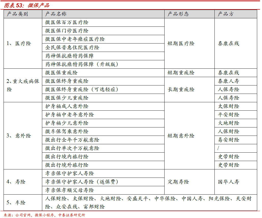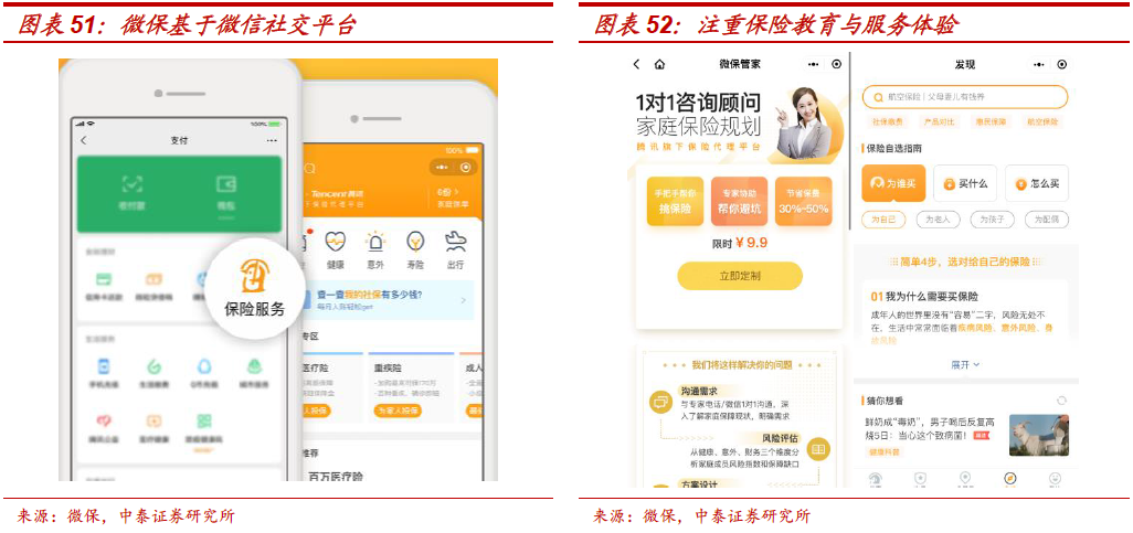 微保:社交裂变的保险平台模式。腾讯的保险业务通过腾讯旗下保险代理平台微保(WeSure)开展,通过微信的连接,包括微保小程序、微保公众号,与保险公司合作为用户提供保险服务,让用户可以在微信进行保险购买、查询以及理赔。1、保险代销。通过腾讯平台连接用户,严选出高性价比保险产品,并提供微保独家优惠与增值服务。2、场景险。微保结合腾讯不同的场景,赋予保险时尚型与有趣性,更能吸引年轻用户。3、能力输出,赋能保险公司。微保输出腾讯的“连接、安全、场景”核心能力,与保险公司深度合作,结合微保的流量、风控、支付优势,及保险公司的精算、承保、核赔和线下服务能力,为用户提供差异化体验。