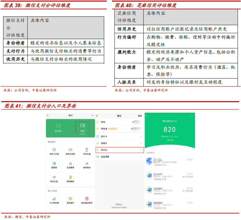 3、微信支付分:腾讯信用体系的搭建。2019年1月初,微信推出微信支付分,将支付行为纳入信用体系,对个人的身份特质、支付行为、使用历史等情况的综合计算分值,上线仅1年便获得了超过1亿用户,同时微信支付分延伸到更广阔的生活场景,同时也进一步扩充了信用评估来源。目前的应用场景包括,一是免押场景:包括共享充电宝、共享雨伞、线上租赁平台等免押租借,以及酒店行业等免押速住;二是先享后付:如网约车、寄快递、电动车充电、共享按摩椅等,需预付费等场景;三是智慧零售:如无人零售机柜,用户支付分达到商户设置的分数门槛,即有机会开柜购物。