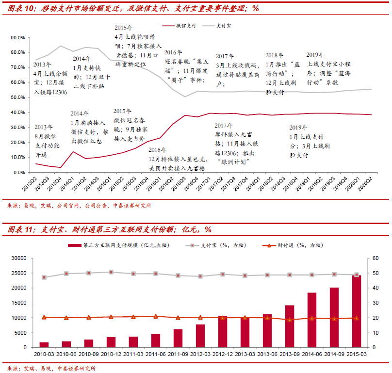 阶段一:2013Q4之前,支付宝一家独大。2003年支付宝成立,作为解决淘宝电商交易信任问题的支付工具逐步被推广使用,背靠阿里、凭借电商的先发及规模优势,支付宝在很长一段时间内,都稳居互联网支付第一名,一家独大,2010-2014年,支付宝在第三方互联网支付市场的份额稳定于约50%。2013年4月支付宝上线余额宝,借助对余额理财市场需求空缺的填补及当时“钱荒”形成市场高利率环境,余额宝迅速成为爆款;另外,2013年12月支付宝率先接入铁路12306,支付宝在电商之外,在金融理财、出行购票等多维度的延展,在移动支付市场份额推至最高(根据艾瑞数据,2013Q4份额达84.3%)。