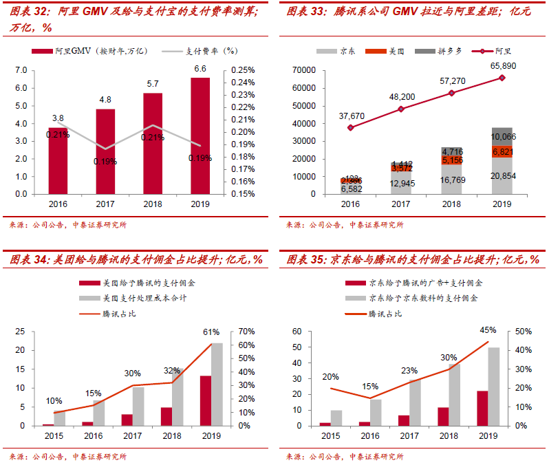 线上费率:微信的线上商业支付费率提升空间预计大于支付宝。由于阿里巴巴与支付宝在体系内电商的独占排他的支付合作,该部分费率提升空间有限。反观微信支付,近年来美团、京东作为腾讯系投资生态,给与腾讯的支付佣金占比是在提升,如美团给与腾讯的支付佣金占美团支付处理成本比例由2015年10%提升至2019年61%,我们预计有支付费率提升的原因,基于微信线上的支付费率市场化程度提升的预测,微信由支付费率提升带来的线上商业支付收入提升空间预计大于支付宝。