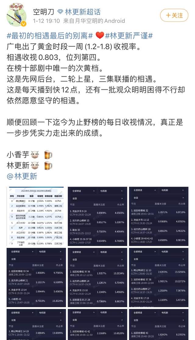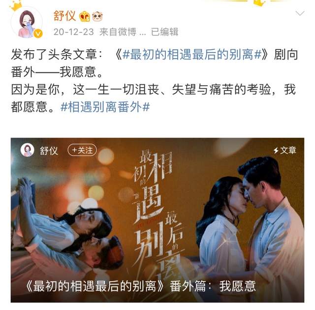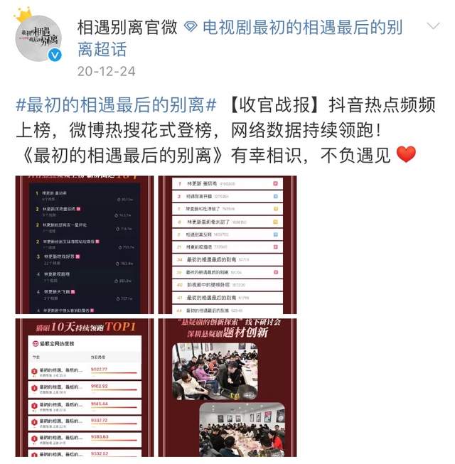 此前《最初的相遇,最后的别离》网播时,就有了不错的成绩。"抖音热点频频上榜,微博热搜花式登榜,网络数据持续领跑",引发了极大的关注。