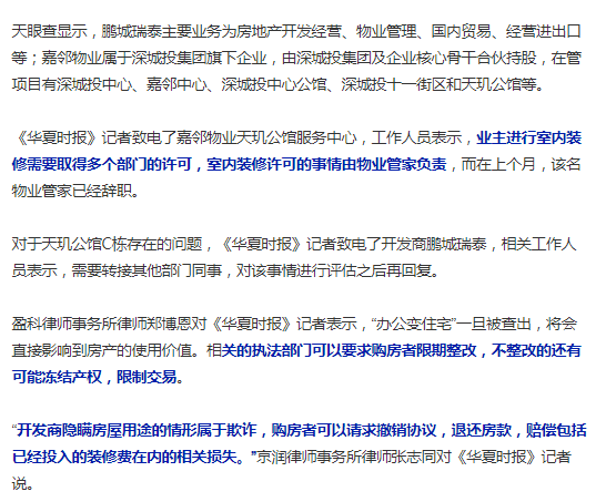 同时,该工作人员对《华夏时报》记者表示,该事件关系复杂,多个部门都牵涉其中,天玑公馆小区C栋还存在虚假宣传。