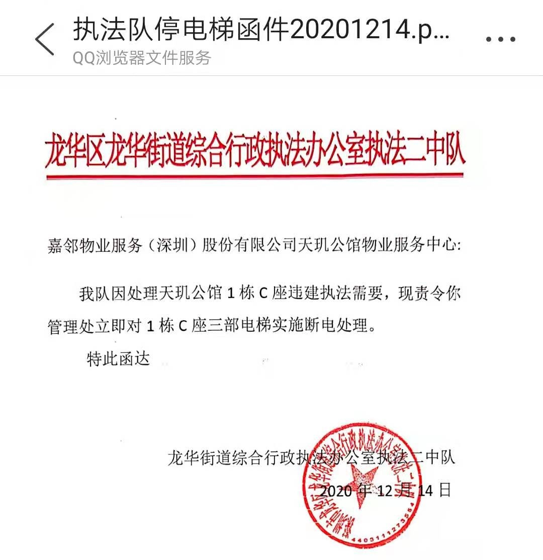 其实,早在2020年便有业主对此事进行反映。2020年6月,龙华街道执法队规划土地监察科(下称“监察科”)给A、B栋业主的回复显示:“我科立即对天玑公馆小区C栋违规扩建进行控停,并监督C栋业主自行拆除整改。”