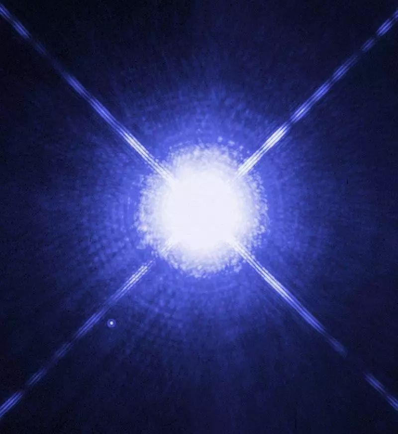 图解:哈伯太空望远镜拍摄的天狼星联星系统,在左下方可以清楚的看见天狼伴星(天狼B)。