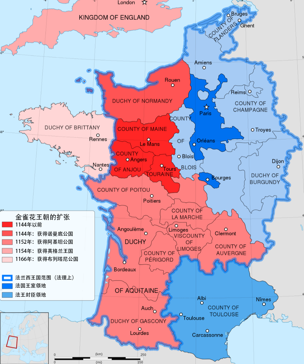 但仿佛是历史给法国人开的一个玩笑,仅仅十年之后,金雀花家族就如同当年的威廉一样,获取了英格兰王位,从法国封臣摇身一变成为了英格兰金雀花王朝的开创者,而他们从法国带走的,除了诺曼底之外,还几乎有法国的半壁江山。