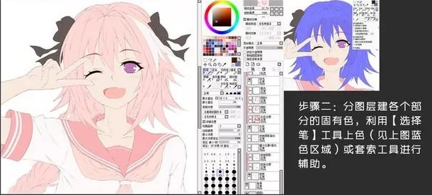 步骤二:分图层建各个部分的固有色,利用[选择笔]工具上色(见上图蓝色区域)或套索工具进行辅助。
