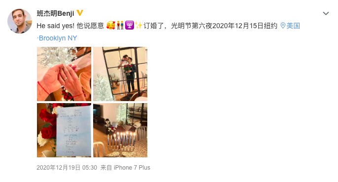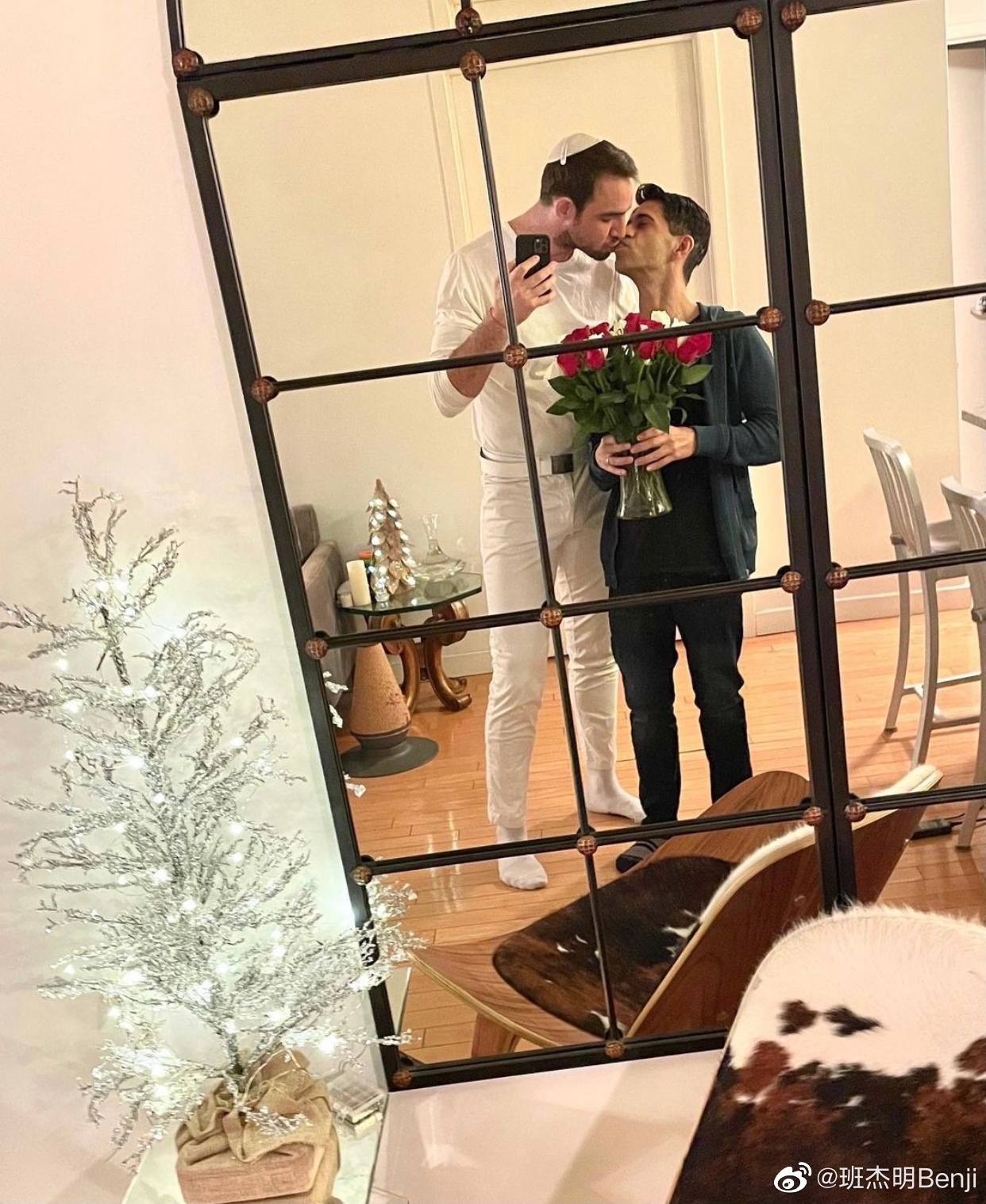 去年年底(也就是上个月)班杰明就在社交平台分享了自己的喜讯,并且还晒了和男友亲吻的照片。配文称:"He said yes! 他说愿意!订婚了,光明节第六夜2020年12月15日纽约。"