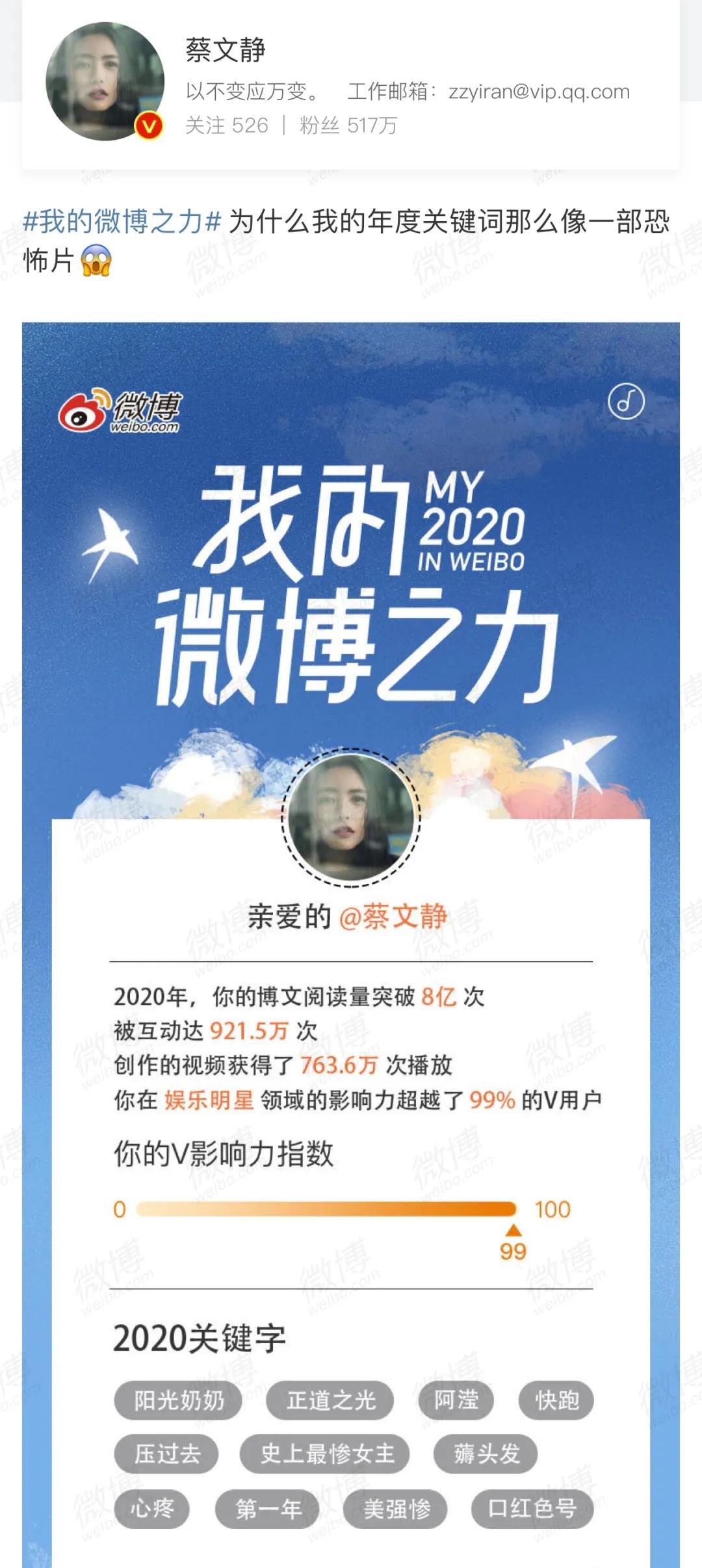 在“我的微博之力”图中,“史上最惨女主”、“薅头发”、“美强惨”、“正道之光”等成为了蔡文静的年度关键字,她还自己发微博调侃,称自己的年度关键字像一部恐怖片。而这些关键字都与《阳光之下》这部剧密切相关。